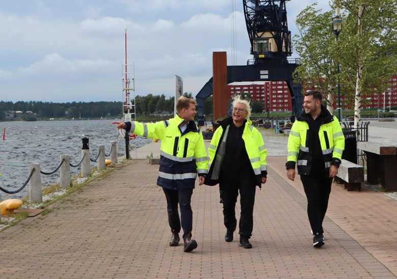 Projektledarna Max Bjurström Sjöfartsverket, Linda Wikman Luleå Hamn och Edin Maslesa Sjöfartsverket är glada över att muddringen är igång.